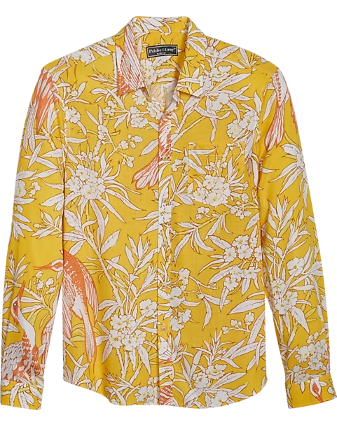 You’ll be set for summer in this lightweight linen-blend sport shirt from Paisley & Gray. In a vibrant yellow, it features a tropical bird pattern.